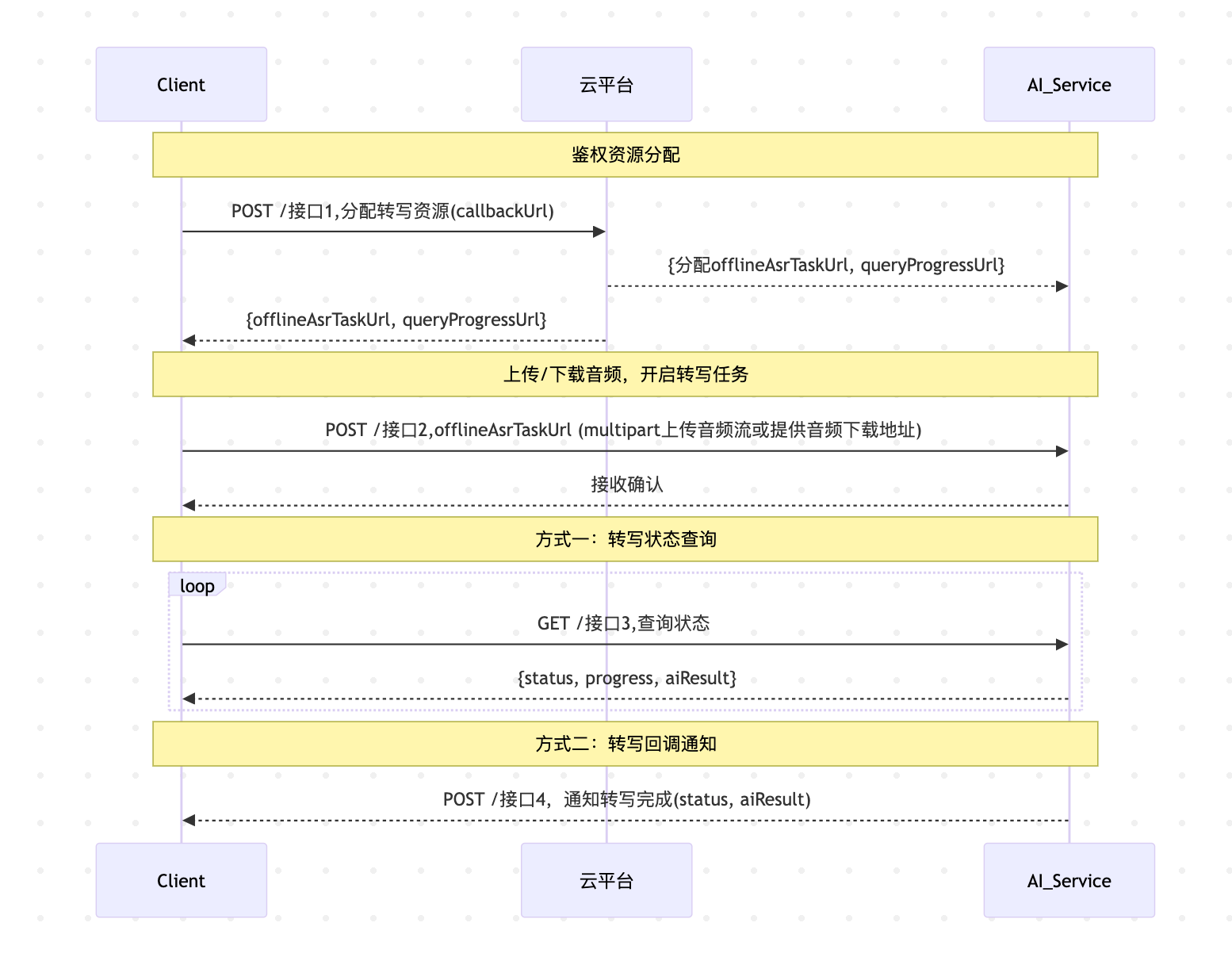 3 | HTTP GET | 查询离线转写状态 | 接口1返回的 | 可轮询调用,获取任务进度或最终结果。 |